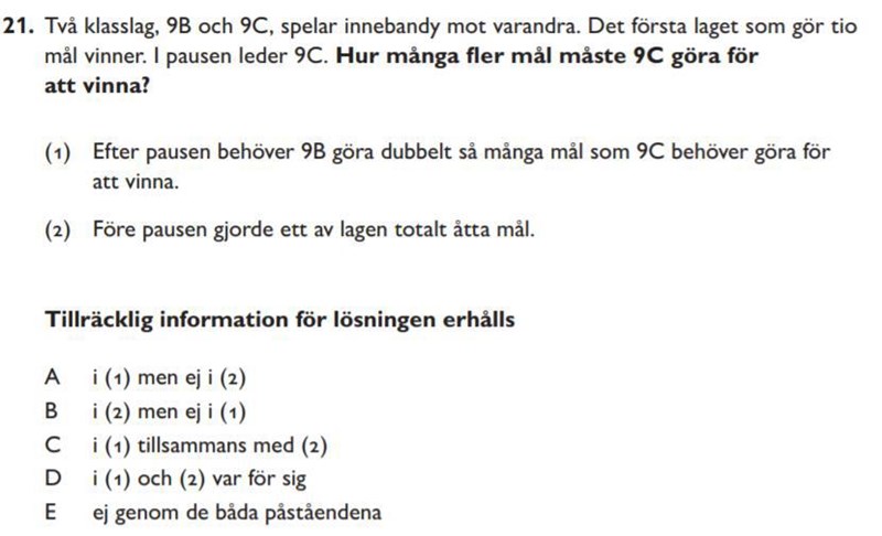 Bara en fråga. Hur lång till tar det för er att utreda saken, och bli överens att det är E som är rätt svar (även om ni har börjat en ytterligare diskussion om hur 9C:an krossar 9B:an?)
