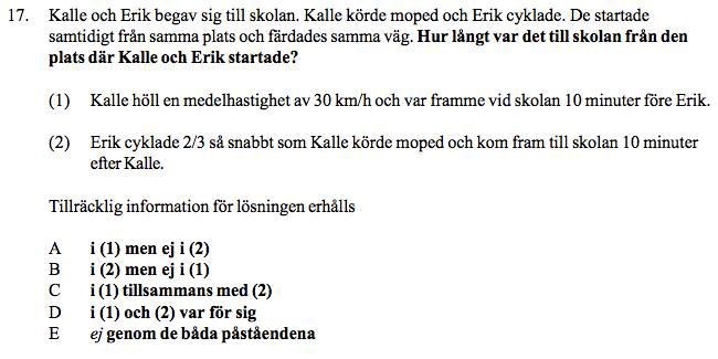 Kalle höll en medelhastighet av 30 km/h enligt påstående (1). Erik hade 2/3 av den hastigheten enligt påstående (2), d v s 20 km/h.