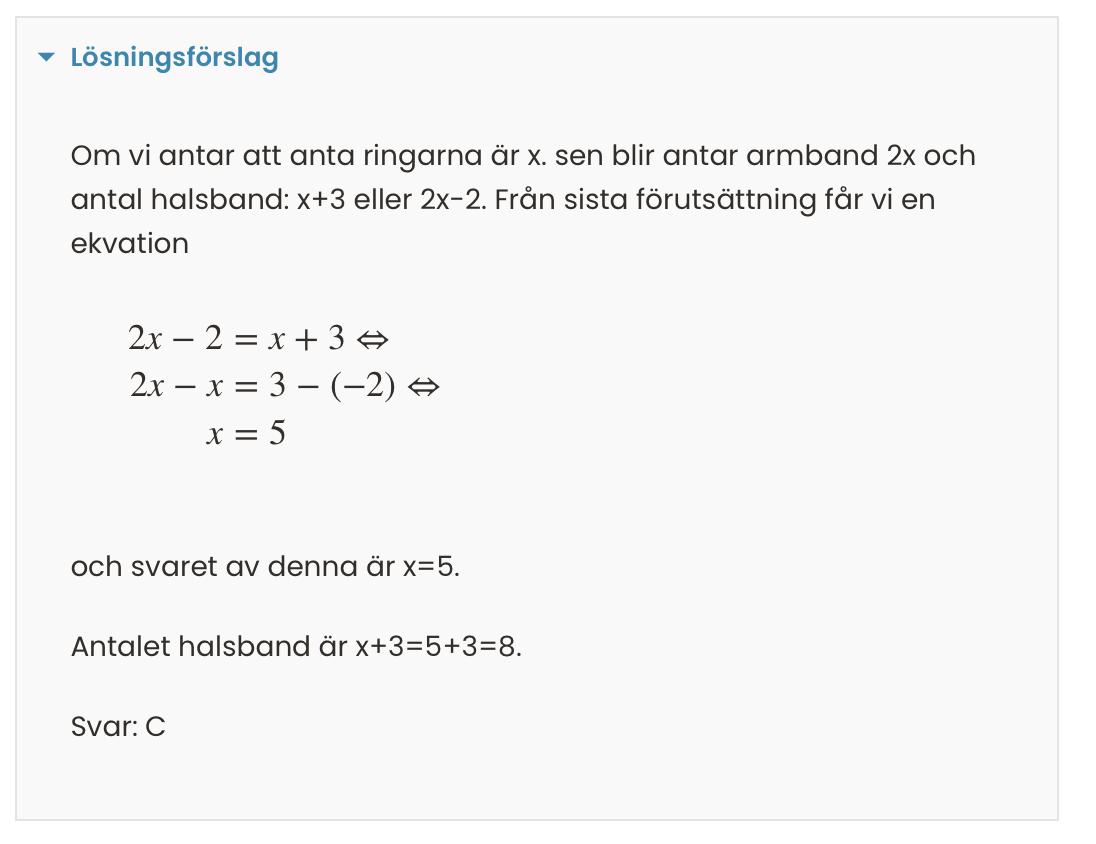 Smaragdalena skrev:greglog skrev:21. I Minnas smyckeskrin finns det halsband, armband och ringar. Armbanden är dubbelt så många som ringarna. Halsbanden är 3 fler än ringarna och 2 färre än armbanden.