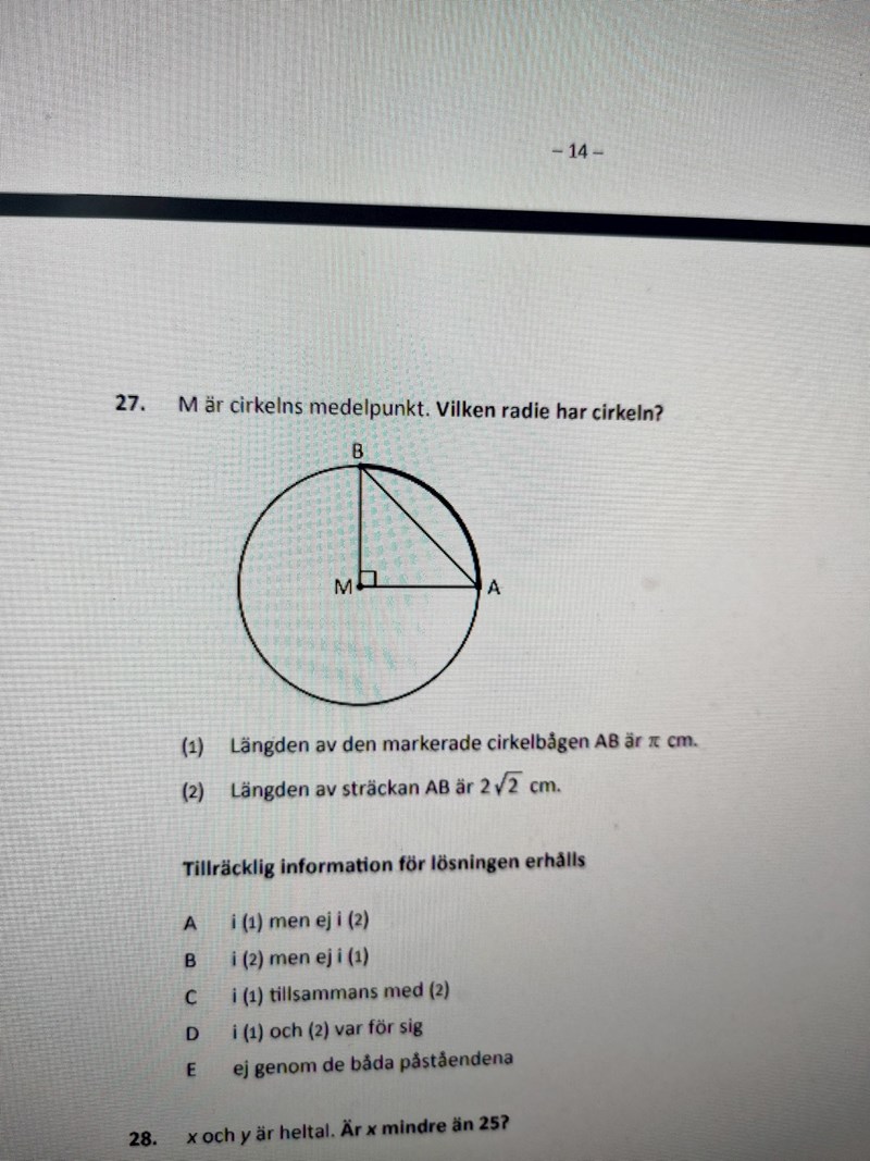 naytte skrev:Eftersom att det är lika långt mellan M och båda punkterna där triangeln rör cirkeln kan du ställa upp följande ekvation:
