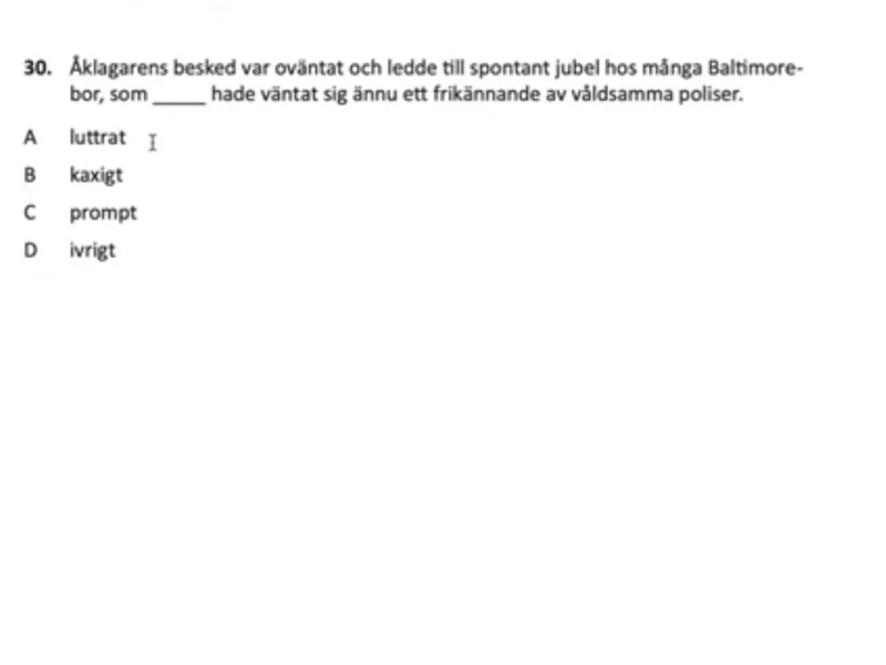 Man kan absolut gå på magkänsla! Du får dessutom inga minuspoäng för felaktiga svar, så om du inte vet svaret, gissa hej vilt! När du är klar med provet ska inga svarsrader vara tomma.