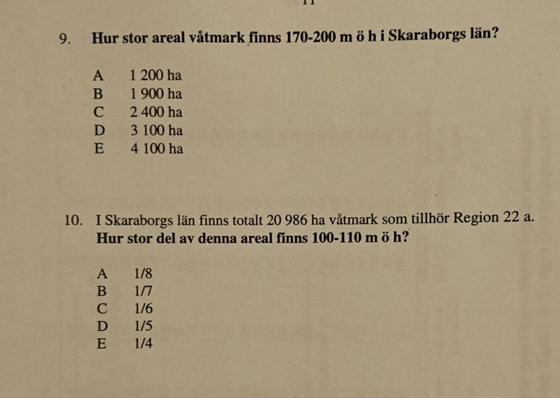 Fråga 9: batongerna är 10 cm långt, så typ 2400 ha, svar C