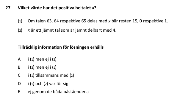 Med påstående (1) får man tre ekvationer som blir 63 = ax + 15, 64 = bx och 65 = cx + 1. Jag tänker då att det inte går att lösa med påstående (1) eftersom det finns flera olika värden på a, b, c, och x som gör att ekvationerna stämmer. T.EX x = 16 ger a = 3, b = 4 och c = 4, medan x = 8 ger a = 6, b = 8 och c = 8. Har jag tänkt rätt?