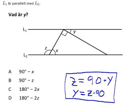 Jag tror de ville att man skulle tänka alternatvinklar. Om L1 och L2 är parallella och det finns en linje som skär båda så är vinklarna på alternerande sidor lika stora. y blir då lika stor som den sista vinkeln i den inritade triangeln. Den vinklen är ju 180-90-x=90-x. Z finns nog bara där för att missleda.