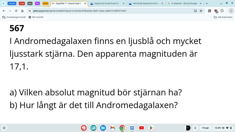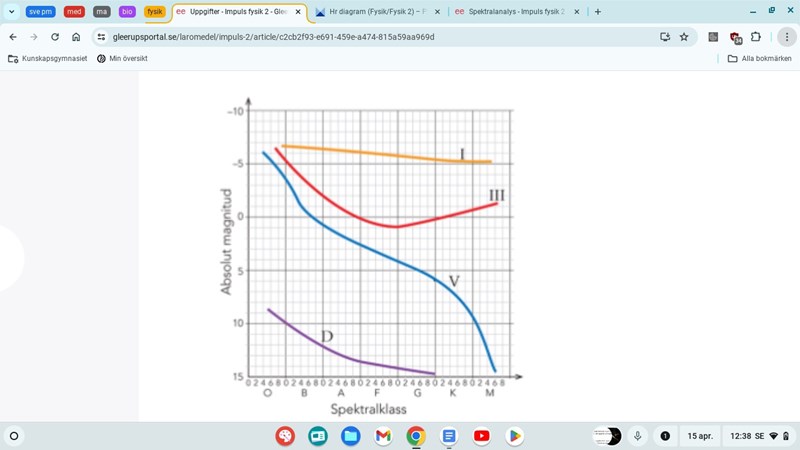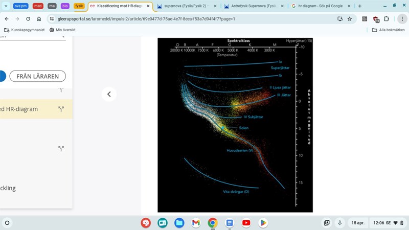 Hej, jag har en fundering. När de säger att man ska kolla en ljusblå stjärna så ska man kolla längst till vänster eftersom temperaturen är som störst då och våglängd och temperatur är omvänd propotionella enligt wiens förskjutningslag. Den som är längst till vänster i hr-diagrammet är luminutetsklass 1a, , vilket ger absolut magnitud på -7 ungefär. Nu hade de sagt att stjärnan är röd, hade jag då kollat på den som pekar åt höger mest, dvs lumintutetsklass V och uppskattat absolut magnitud till 15? eller tänker jag helt fel?
