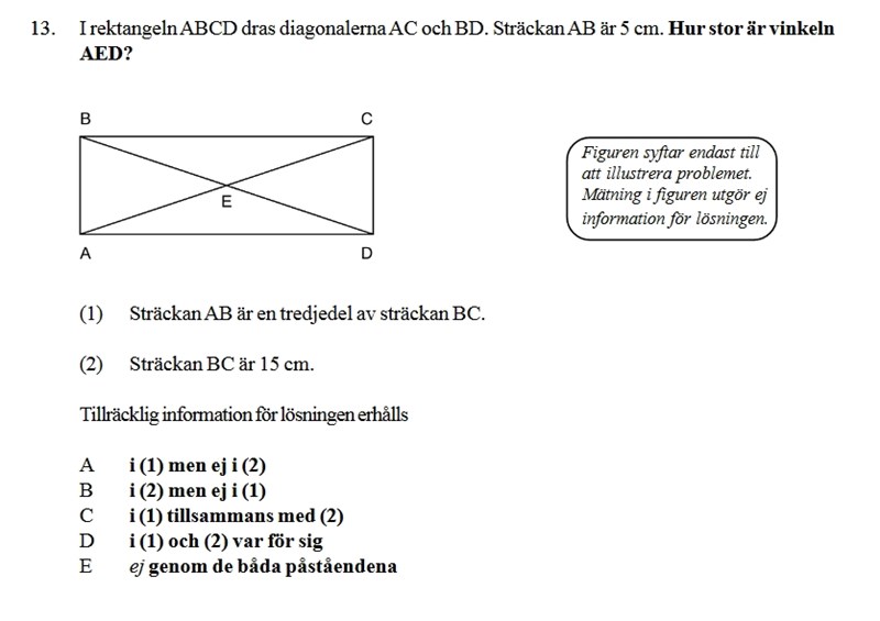 Det händer att jag stöter på en HP-uppgift som jag löser med trigonometri. Det händer också att jag senare upptäcker att trigonometri inte var den bästa metoden, utan att jag missat en enklare lösning som bygger på vanlig geometri. Dock inte i det här fallet. Jag kan inte se hur denna kan lösas utan trigonometri, och därmed kan jag inte se hur någon som inte känner till dess trollformler ska veta att uppgiften faktiskt kan lösas och inte svarar E.