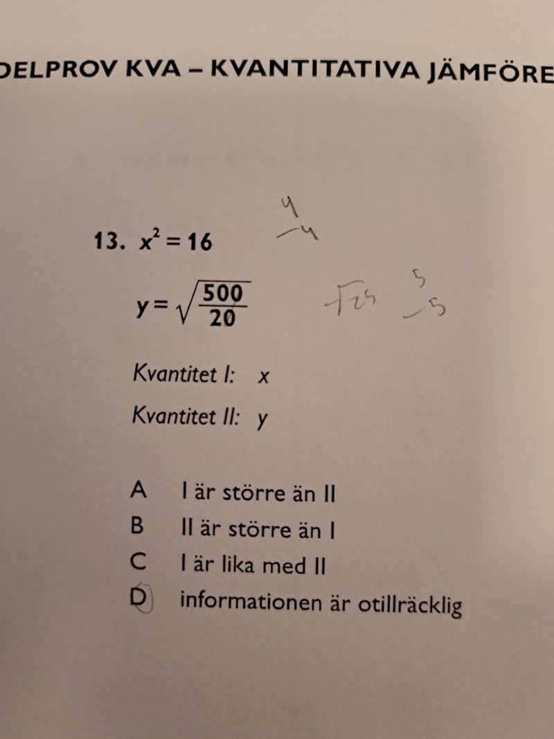 Jag tänkte att roten ur 16 kan vara både -4 och 4 samt att roten ur 25 kan vara både -5 och 5. Därför kan man inte veta vilken som är störst och informationen är otillräcklig. Det stämmer inte, svaret är B - II större än I.