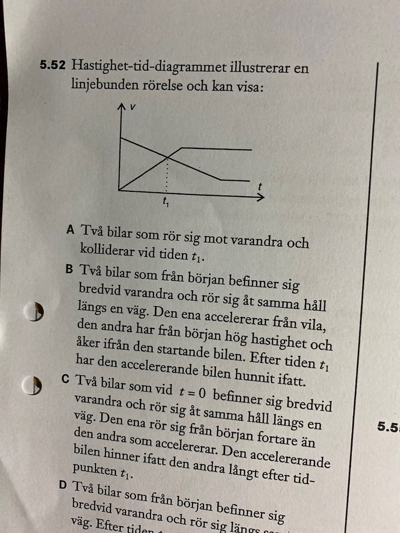 Hej! Visar grafen att en bil startar från hastigheten 0km/h, och ökar med samma hastighet då k värdet är densamma i början. Sedan Rröffar bilen en annan bil, de möts och hastigheten är densamma. Sedan blir hastigheten konstant alltså att hastigheten kommer att vara densamma för resten av tiden.