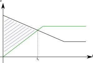 En annan bil börjar med en starthastighet till skillnad från den andra bilen. Hastigheten minskas med lika mycket och tillslut blir hastigheten densamma.