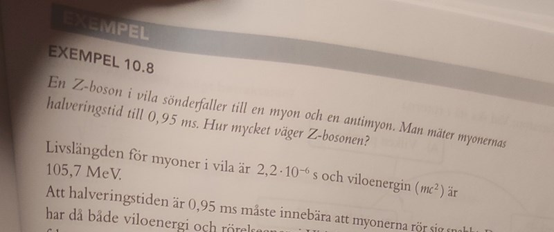 Jag har en fråga kring detta exemplet i boken. Hur kommer man fram till 105,7 MeV? Jag testade (2,2*10^-6)*ljusets hastighet^2 men det blev 197725*10^6 så inte 105,7.