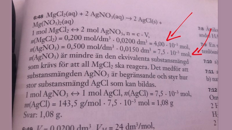 Det behövs 1mol magnesiumklorid och 2 mol silvernitrat för att det skall bildas 2 mol silverklorid. 2.0,004 > 0,0075, så det är silverjonerna som tar slut först.