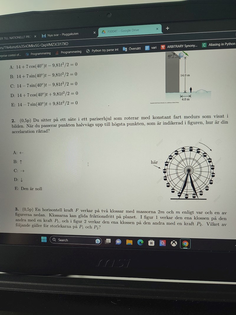 Hej! Jag undrar om jag tänker rätt på fråga 2 från denna gamla tenta? Jag tänker att accelerationen är riktad så --> (C) när personen är halvvägs från högsta punkten eftersom hastigheten är riktad uppåt och accelerationen är vinkelrät mot hastigheten och personen ska ju röra sig åt vänster enligt hjulets bana?