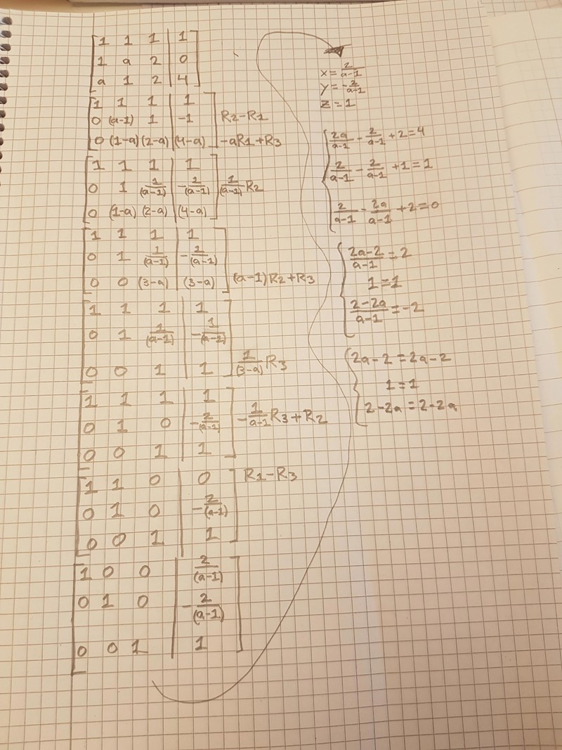 Körde på med eliminering och tänkte att det skulle ge något, men kommer bara fram till att systemet saknar lösning då , och att det har entydliga lösningar för alla andra värden på a.