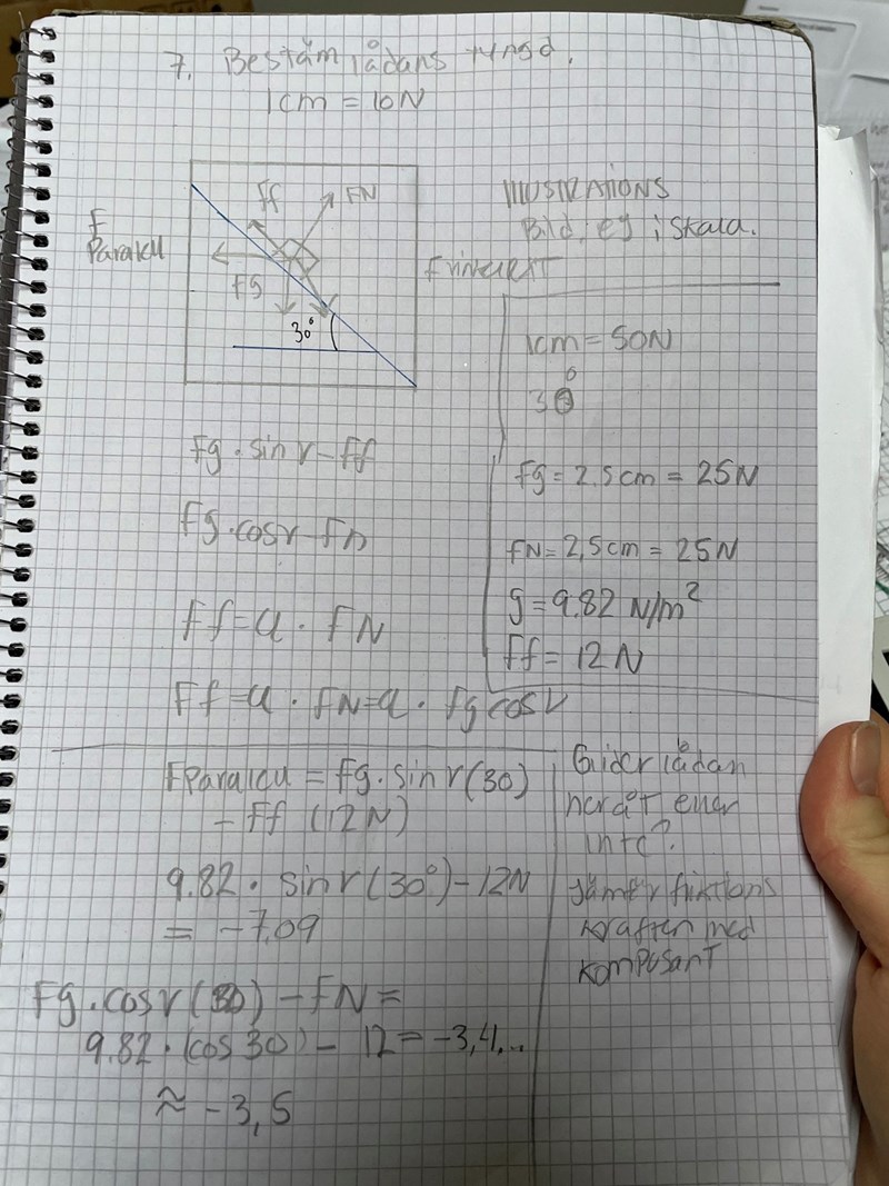 upogift 7. Jag hade en tanke om att beräkna den resulterande kraften först (ta reda på mer för att ta reda på lådans tyngd) för jag läste i boken ”När vi vet den resulterande kraften på lådan kan vi bestämma accelerationen med hjälp av kraft ekvationen F= m/a.