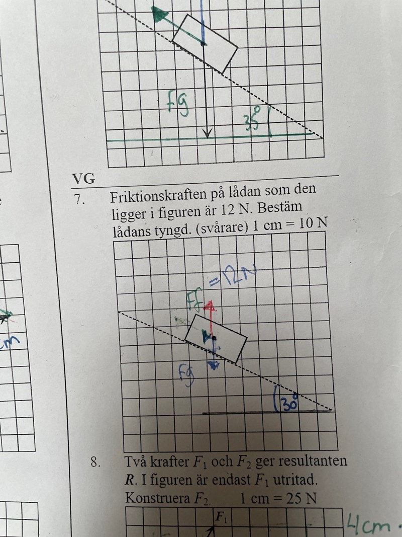 Jag förstår kanske inte riktigt denna svårare uppgift 7. Det står en skala i texten men jag ser inga kraftpilar. Det som finns ser ut som att du har ritat.