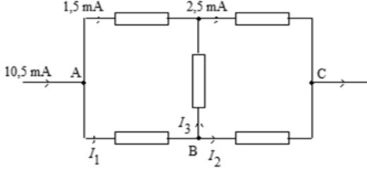 I1I_1 är lättast. Det kommer in 10,5 mA till punkten A. 1,5 mA fortsätter uppåt. Hur mycket fortsätter neråt?