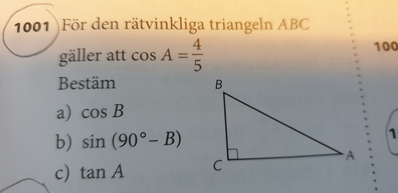 b) Använd sin(90-v) = cos(v), v är här B, och vi vet vad cos B är för något ifrån a.