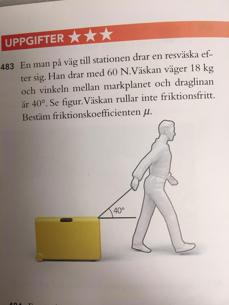 Summan av y-ledets kraftkomposant som mannen drar med och normalkraften motsvarar tyngdkraften. Med hjälp av detta så räknar du ut normalkraften och med hjälp av formeln för friktionskraft beräkna my.