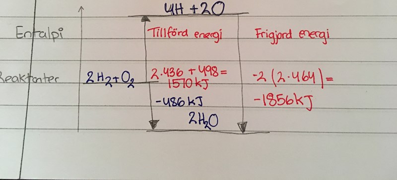 Du får betala 1570 kJ för att bryta bindningarna i syrgas och vätgas. Du vinner 1856 kJ som frigörs när bindningarna i vatten skapas.