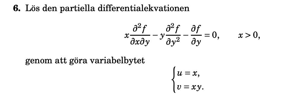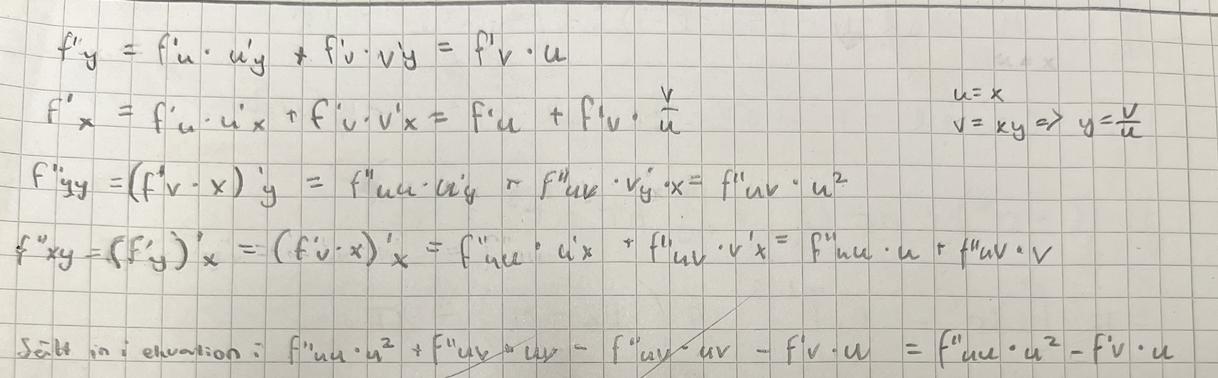 Jag har lärt mig att man ska använda kedjeregeln och beräkna f"xy, f"yy och f'y genom att skriva om det till f"uv, f"vv med mera då f(x,y) = f(u(x,y) , v(x,y)) men jag får alltid fel när jag räknar på det.
