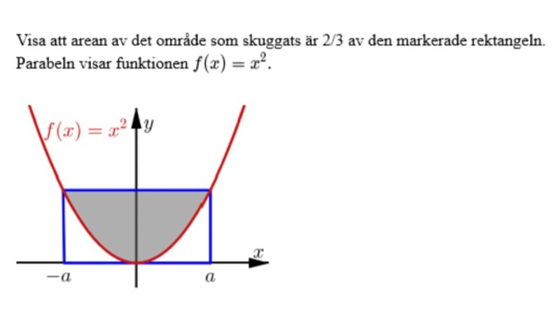 Andragradskurvan f(x)=x2, vilket vi vet sedan tidigare. Funktionen vi ska integrera i intervallet [-a, a] blir då . Då blir integralen som jag skrev ovan.