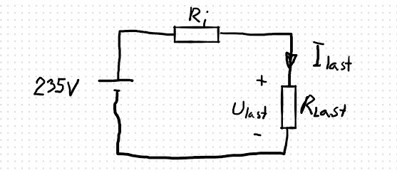 Spänningen faller över Ri när du lastar med Ilast, Ulast = 235V - Ri * Ilast