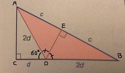 Det innebär att triangeln är en halv liksidig triangel och att vinkel ADC är 60o.