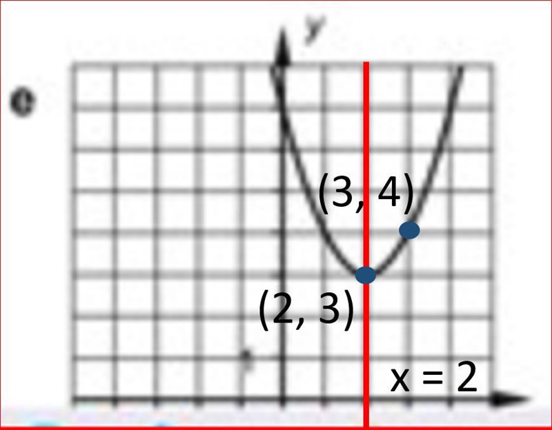 Jag har markerat symmetrilinjen i rött, vertex och ytterligare en punkt på grafen i blått.