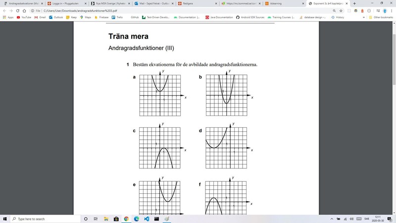 Läs först detta avsnitt som beskriver andragradsfunktioner, andragradsekvationer, min- och maxpunkter, nollställen och symmetrilinjen.