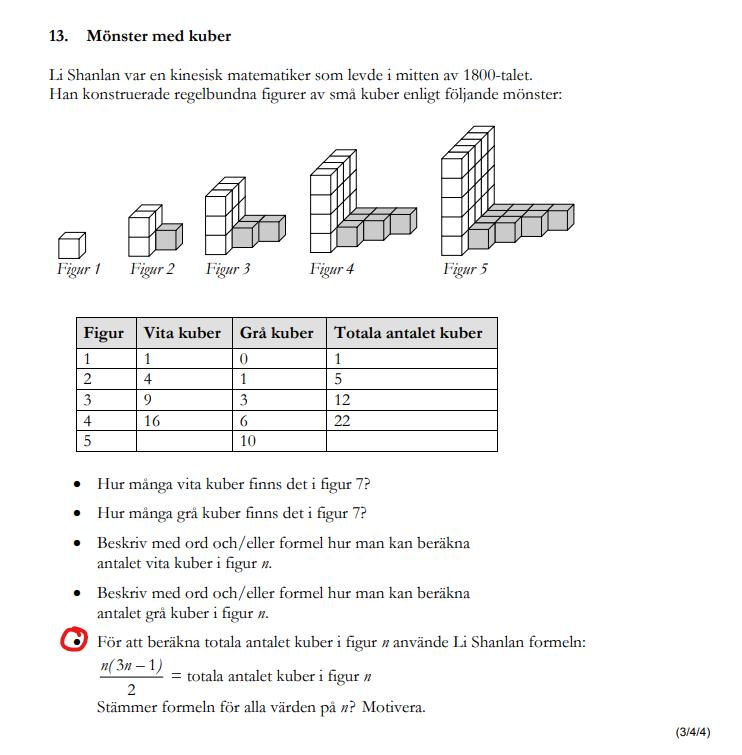 Det är den sista punkten jag undrar över. Jag ser direkt att jag kan göra om detta till en summa: , där antalet kuber i den n:te figuren ges av summan av alla föregående tal och .