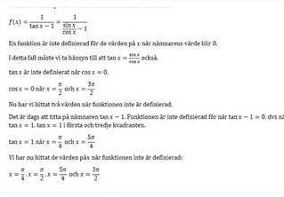 Ekvationen tan(v) = 1 har alltså lösningarna v = pi/4 och v = 5pi/4 i intervallet 0 < v < 2pi.