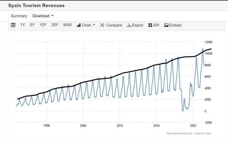 Linjen är inte helt rak men man kan ändå se att den nya toppen är lite högre än genomsnitts tillväxten, det är ju förstås väldigt bra för Spaniens ekonomi. Du kanske kan skriva om hur turismen efter restriktionerna har påverkat ekonomin.