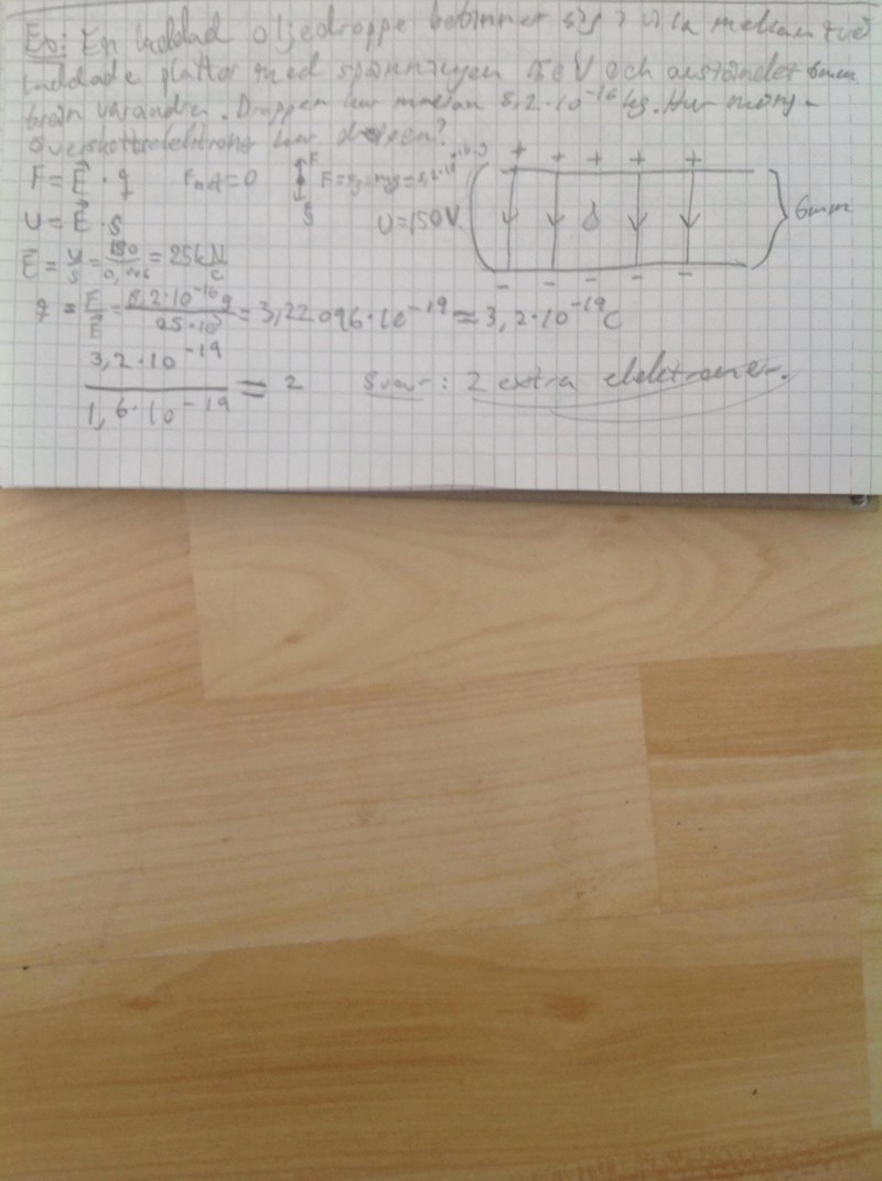 Smaragdalena skrev:Det syns på din bild att det är positiva laddningar ovanför oljedroppen. Laddningarna bidrar till en kraft uppåt som är lika stor som gravitationen neråt. Alltså måste oljedroppen vara negativt laddad (för hade den varit positivt laddad, hade den repellerats av de positiva laddnigarna ovanför och attraherats av de negativa laddnigarna under, och då skulle gravitationen och Coulomb-kraften verka åt samma håll och oljedroppen skulle inte vara i vila).