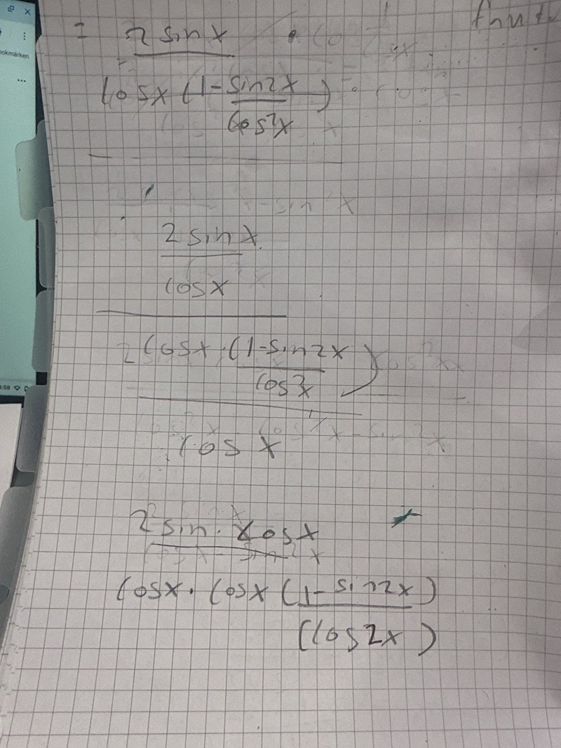 Hur blir cos x bara kvar i nämnaren. Jag försökte men förstår inte hur jag ska forsätta