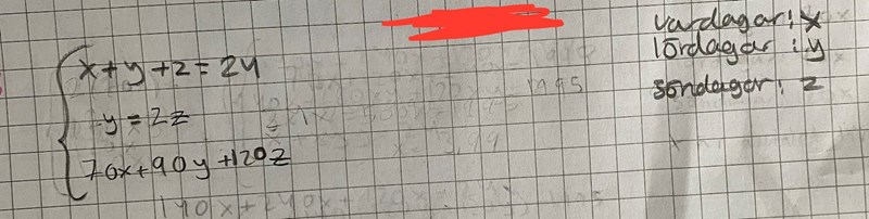 har glömt o skriva att i sista raden av ekvationsystemet ska det vara 70x+90y+120z=1995