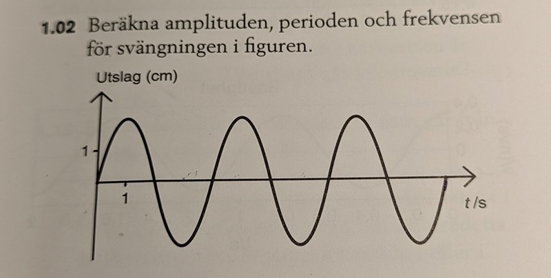 En period är tiden det tar för grafen att göra en topp och en dal. Eller genomgå en något tills att det upprepar sig. Vi ser att 1:an sitter mitt i toppen alltså måste den vara 2s lång. En topp + en dal blir då