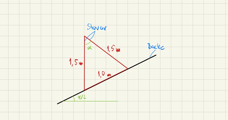 Som jag indikerat i figuren så är toppvinkeln i triangeln som bildas av stavarna dubbelt så stor som backens vinkel mot horisontalplanet.