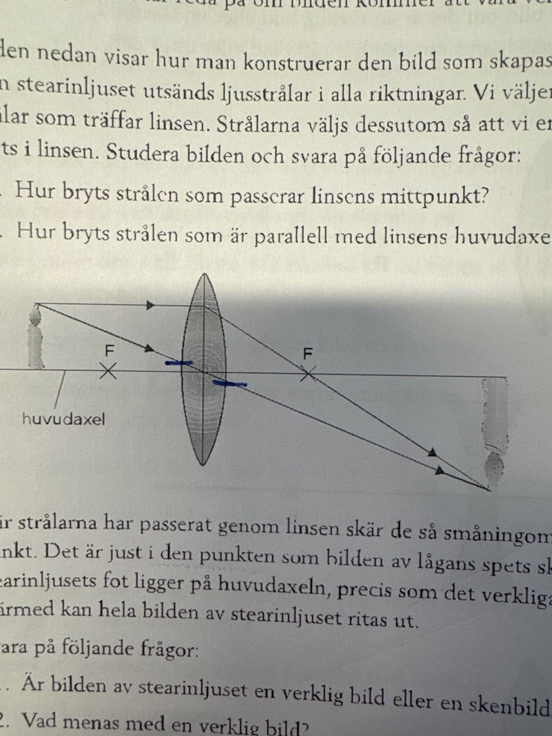 Verkligen! Men hur i hela världen ska man förklara hur strålen passerar linsens mittpunkt? Vad är det ens de frågar efter? Har du någon aning?