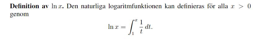 jag har läst en definition av ln x. Men förstår inte riktigt var i från man kom fram till det. Alltså hur härledde man denna integral? Mha derivatan kanske och primitiva funktioner?