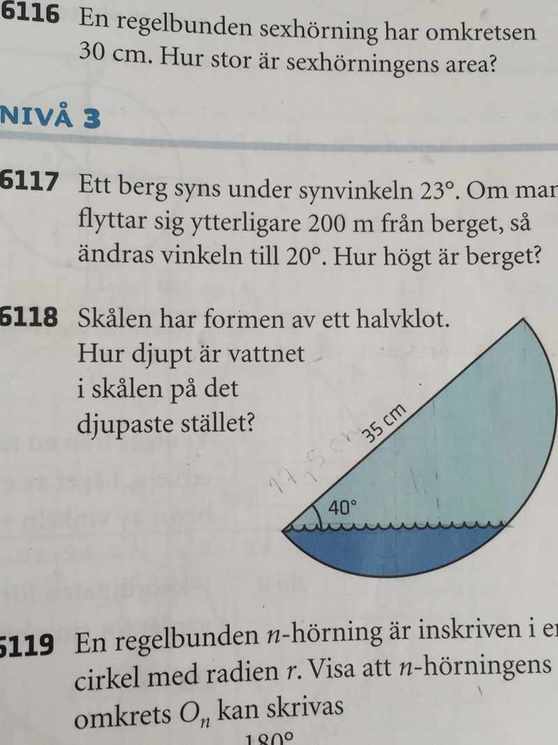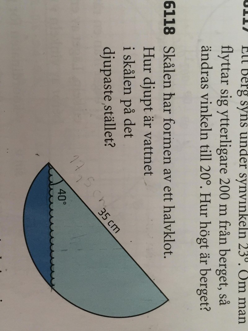 En start är att tangenten i punkten på cirkeln där det är som djupast, är parallell med vattenytan. Dra sedan en linje mellan den djupaste punkten och mittpunkten på cirkeln. Hur kan man sedan fortsätta?