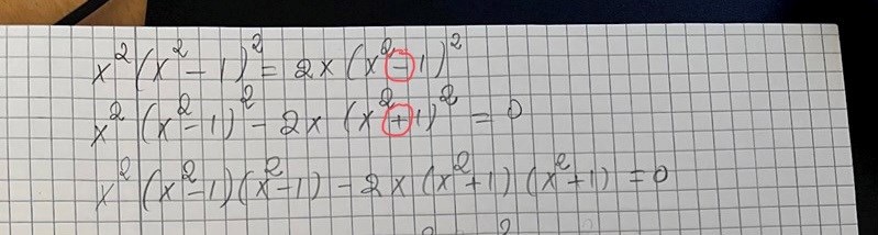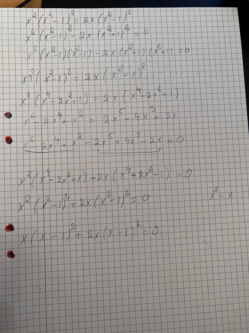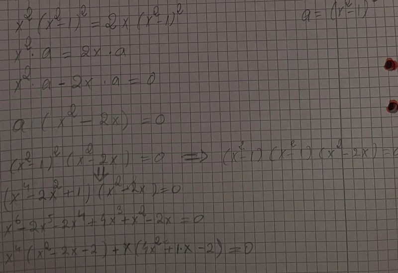 I vänsterledet har du två faktorer (x2-1)2 och x2-2x, vars produkt ska vara lika med 0.