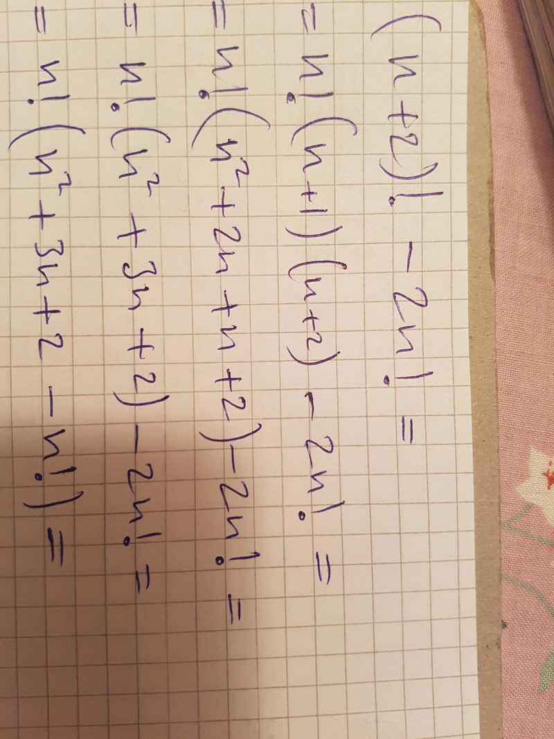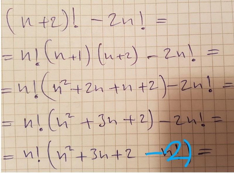 2n! = 2*n! vilket betyder att det som blir kvar inom parentesen ska vara 2 och inte n!: