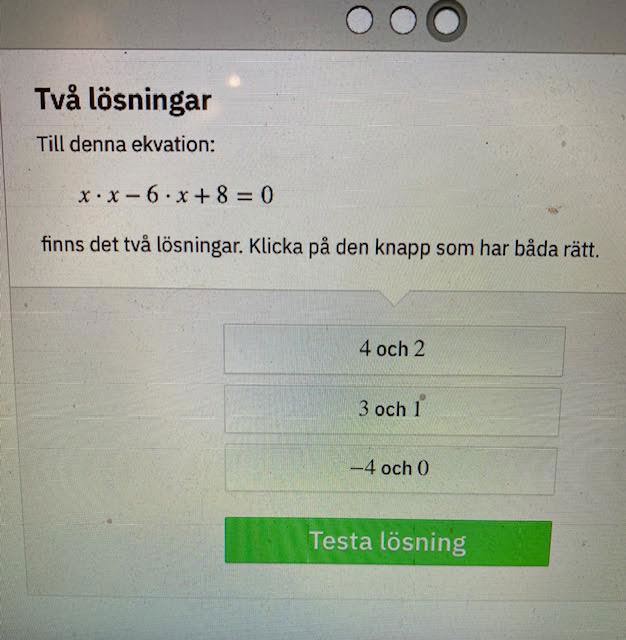 Du ska alltså inte hitta lösningarna på egen hand utan du ska säga vilket av de tre alternativen som innehåller ekvationens lösningar.