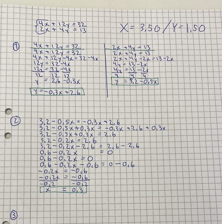 Din lösning ser i princip rätt ut ända tills din division 0.6/02 som inte blir 0.3 (prova med räknare) men jag tycker inte du ska dividera dina ekvationer för att få ett ensamt y. Då tappar du precision om divisionen inte går jämnt ut som kan ställa till det för dig i dina senare beräkningar. Multiplikation är ok för då tappar du ingen precision.
