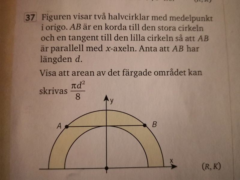 Jag kunde göra ekvationerna för att få: pi/2 * (R^2 - r^2) där R är stora cirkelns radie och r är lilla cirkelns radie. Jag fattar dock inte hur man vet sambandet R^2 - r^2 = (d/2)^ 2