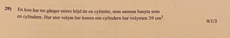 Jag vet inte om jag ska göra något med 3 eftersom det ända jag vet med höjden är att konen är 3 gånger så stor som cylindern. Där ifrån kan jag räkna ut konens volym.