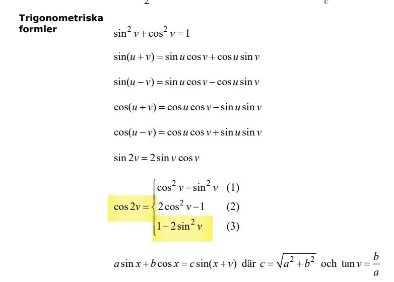 Yngve skrev:Ser du någon formel som innehåller både cos(2v) och sin2(v)?