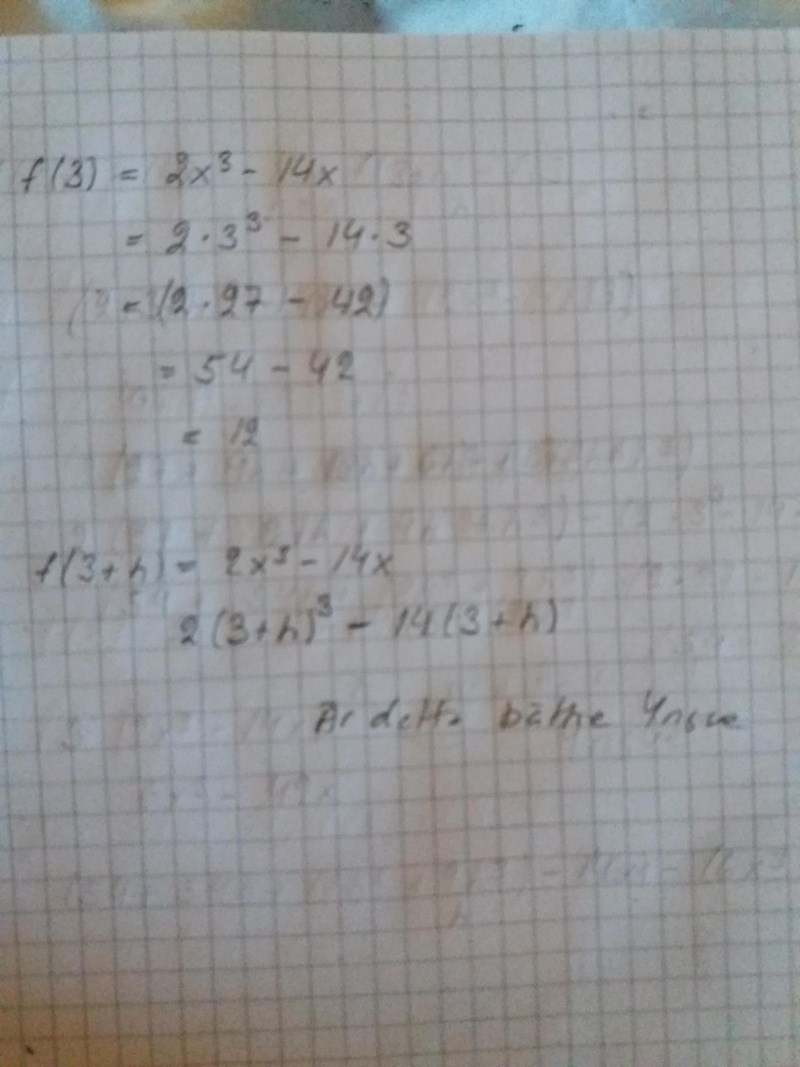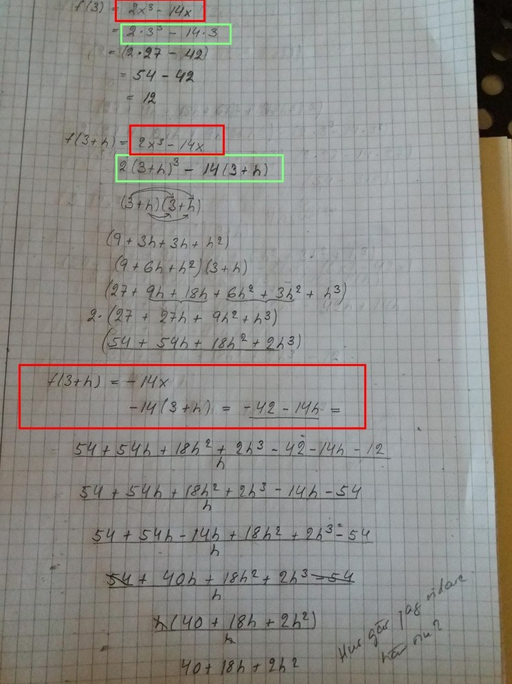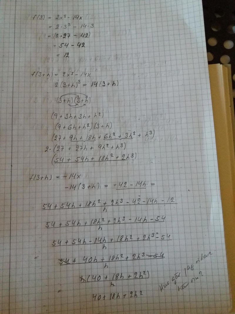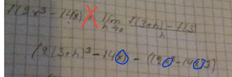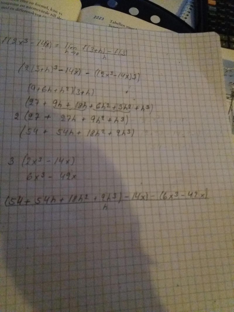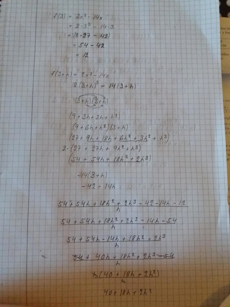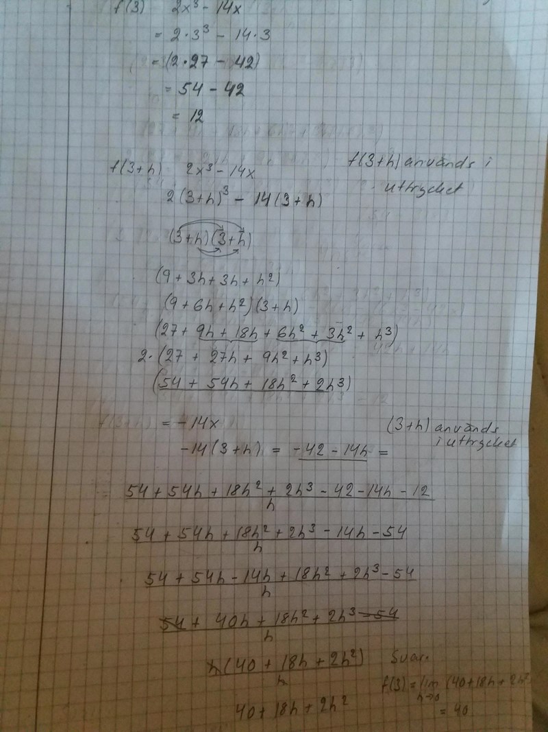 Du går från (3+h)^3 till (3+h)^3 - 14(3+h) och vidare till ( (3^3 - 14*3) - ((3+h)^3 - 14(3+h)) ) / h