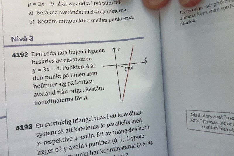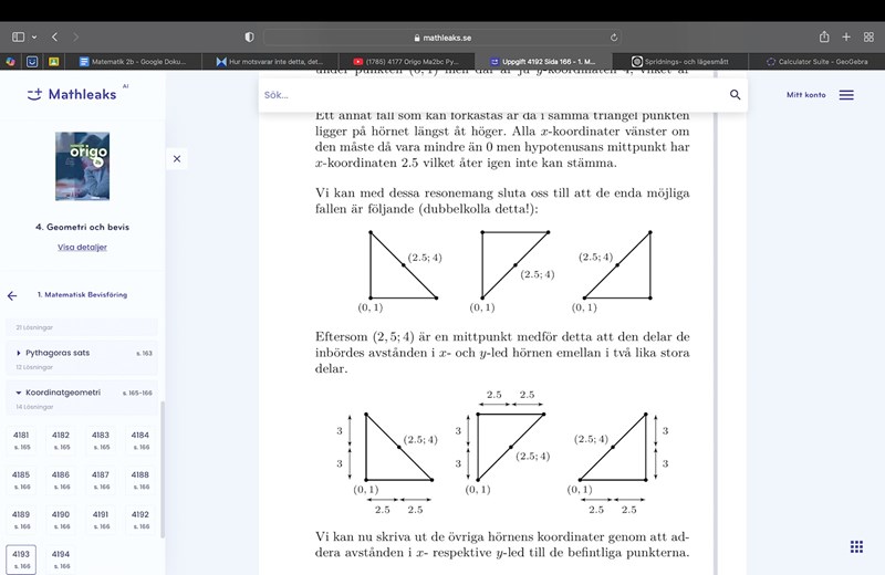På denna uppgift, 4193, så ska tänker jag att det endast finns en av dessa trianglar som är möjliga, då det specificeras i uppgiften att kateterna är parallella med x- respektive y-axeln. Medan i de 2 andra trianglarna, den åt vänster och den i mitten här på facit, tänker jag att de inte har en katet som är parallell med y-axeln, då de har en linje som är rakt på y-axeln, inte parallellt.