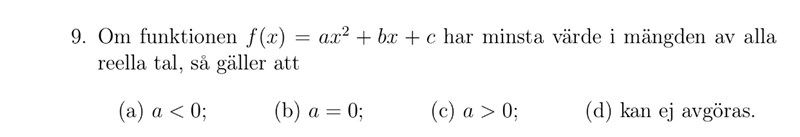 - Om så behöver man inte kvadratkomplettera (då skulle man dividerat med noll!) eftersom då är och funktionen saknar minsta värde och saknar största värde (förutsatt att ).